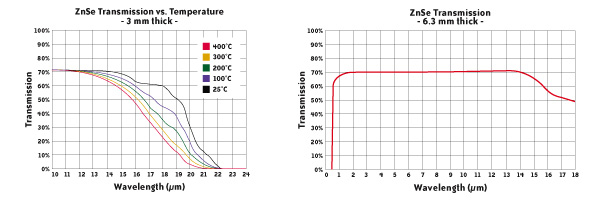 ZnSe is a preferred material for lenses, windows, output couplers and beam expanders for its low absorptivity at infrared wavelengths and its visible transmission. For high-power applications, it's critical that the material bulk absorption and internal defect structure be carefully controlled, that minimum-damage polishing technology be employed, and the highest quality optical thin-film coatings are used. The material absorption is verified by CO2 laser vacuum calorimetry. Our quality assurance department provides testing and specific optics certification on request. ZnSe is non-hygroscopic and chemically stable, unless treated with strong acids. It's safe to use in most industrial, field, and laboratory environments.